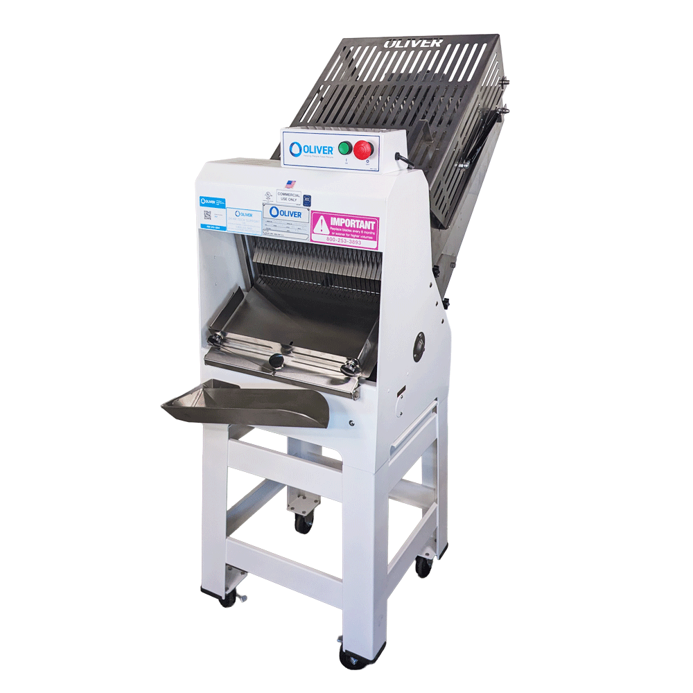 - Single loaf pusher gently and safely guides loaf into slicing blades